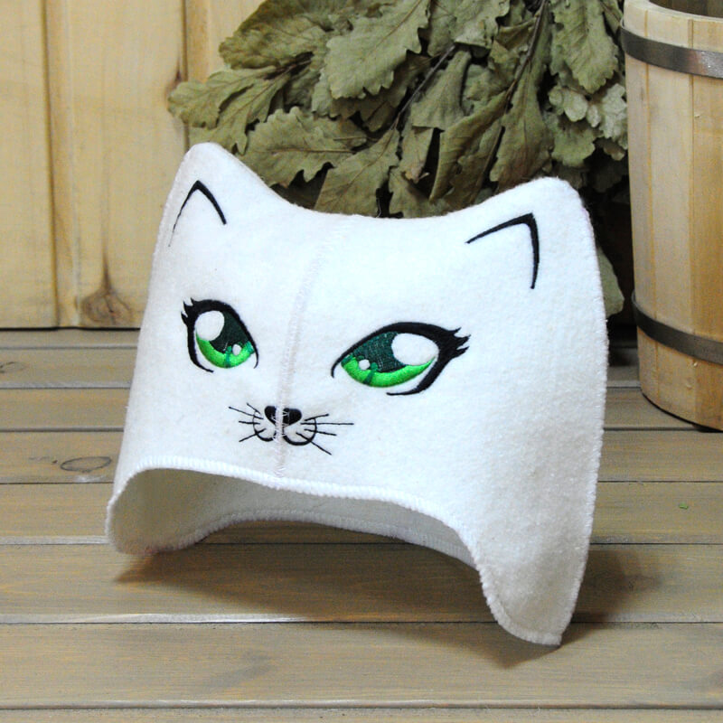 Шапочка для бани и сауны женская  "Кошечка 3D", из полушерсти, праздничная коллекция 2026. Эта шапочка станет вашим надежным спутником во время расслабляющих процедур, обеспечивая защиту от перегрева и сохраняя тепло, позволяя вам наслаждаться баней с комфортом. Этот замечательный аксессуар станет не только практичным, но и оригинальным подарком.