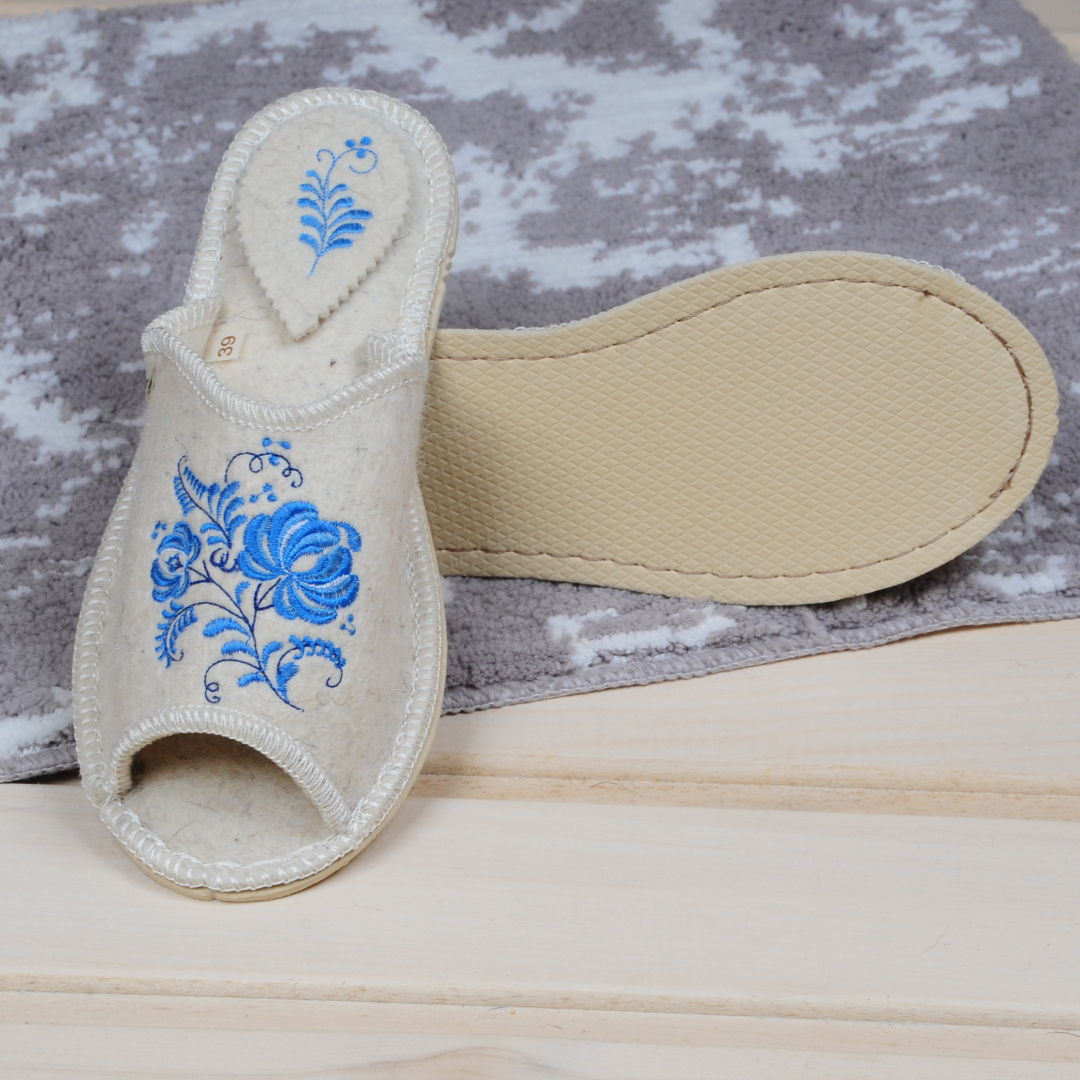 Женские открытые войлочные тапочки с вышивкой "Гжель" — это идеальное сочетание стиля, комфорта и уюта для вашего дома. Их нежный войлочный материал обеспечивает мягкость и тепло, позволяя вашим ногам отдохнуть после долгого дня.